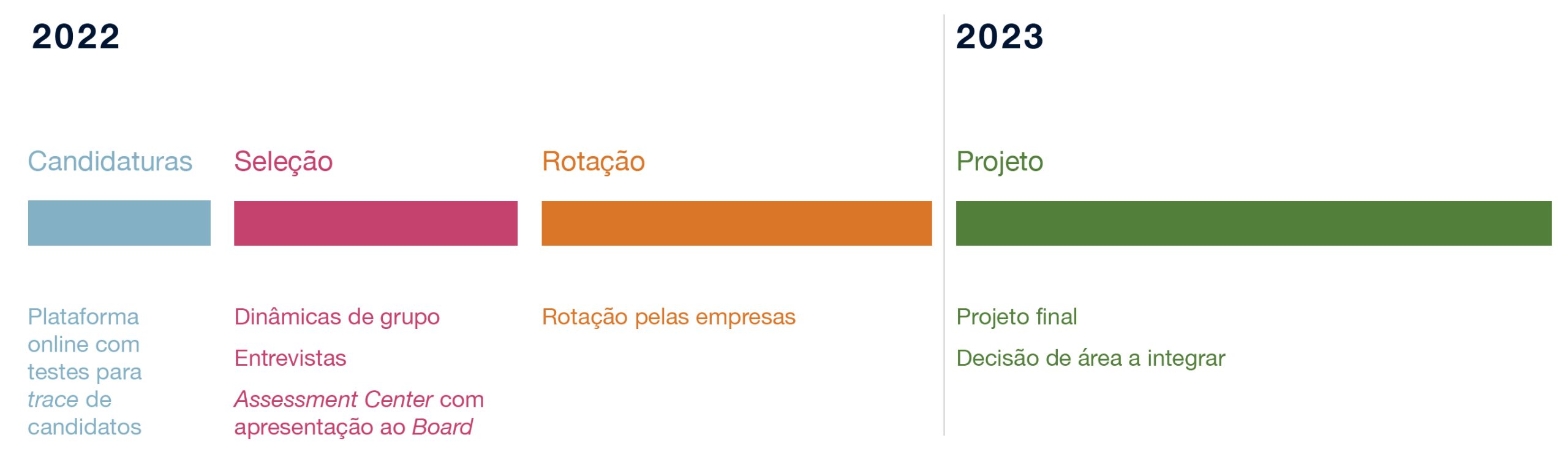 Terás a oportunidade de conhecer diferentes áreas de negócio, trabalhando em uma ou mais empresas de cada uma das áreas. Terás ainda a oportunidade de exercer diferentes funções numa lógica de job rotation: